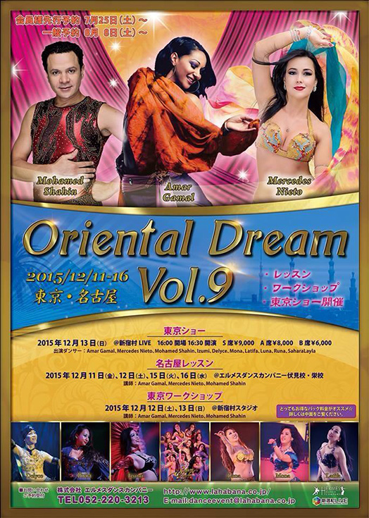 東京ショー 2015/12/13(sun) @新宿村LIVE 16:00開場 16:30開演 S席¥9000 A席¥8000 B席¥6000 Dancer: Amar Gamal,Mercedes Nieto,Mohamed Shahin,Izumi,Delyce,Mona,Latifa,Luna,Runa,Saharalayla