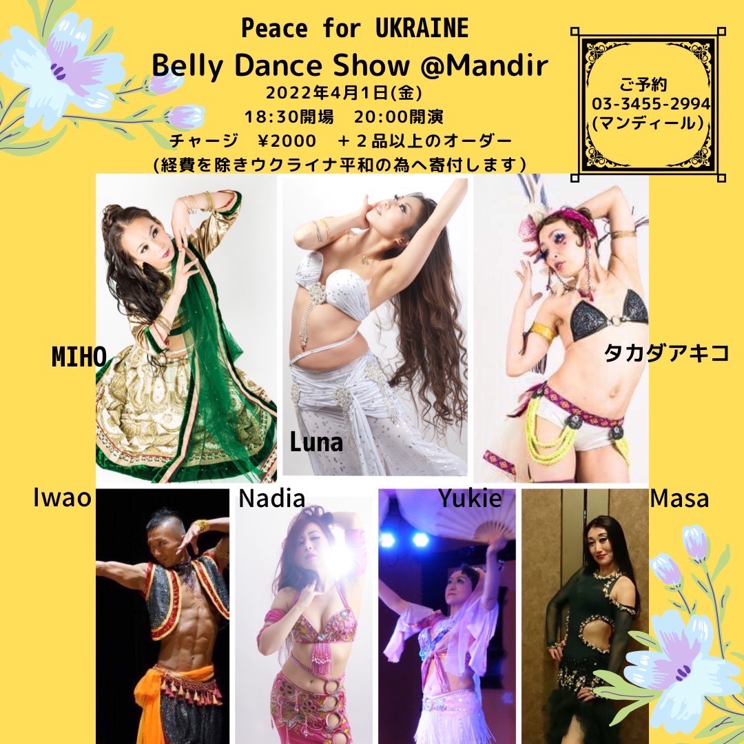 Belly Dance Show 〜Peace For Ukraina〜 ◉4月1日金曜 ◉open 18:30 start 20:00 ◉チャージ 2000円 +2品以上のオーダー(経費を除き、ウクライナ和平のために寄付します) ◉マンディール 浜松町 03-3455-2994 皆さまのご予約をお待ちしております!